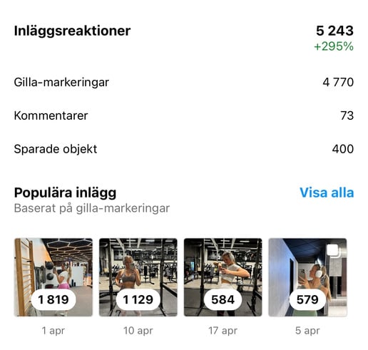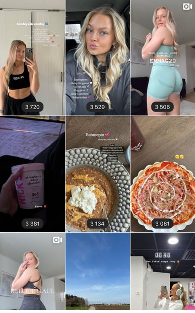 På Instagram-storys uppdaterar jag dagligen om mitt liv, kost och träning. Jag delar med mig av mina träningspass för att ge mina följare daglig motivation och enkelt kunna ta inspiration till sina egna träningspass.